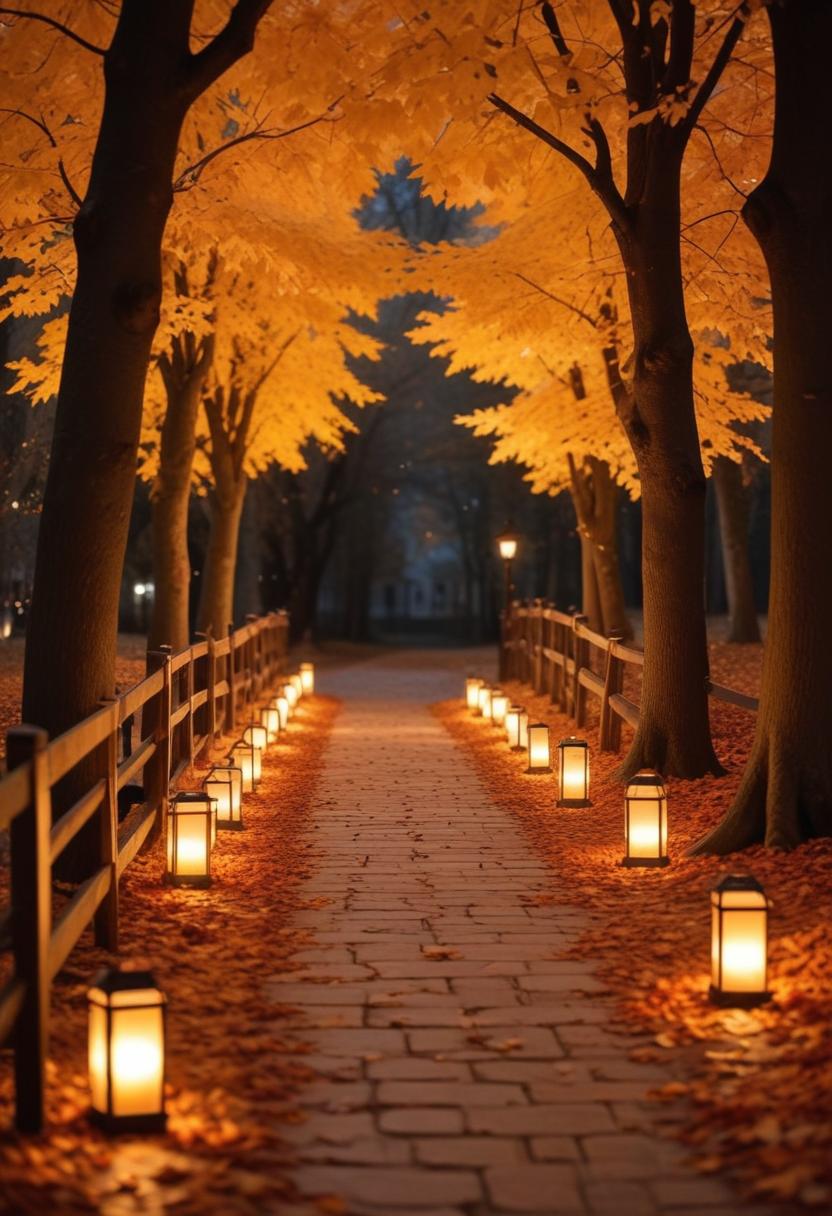 ambiance, autumn, evening, fall, glow, golden, landscape, lanterns, leaves, light, nature, night, outdoors, park, path, romantic, scenery, stone, trees, walkway