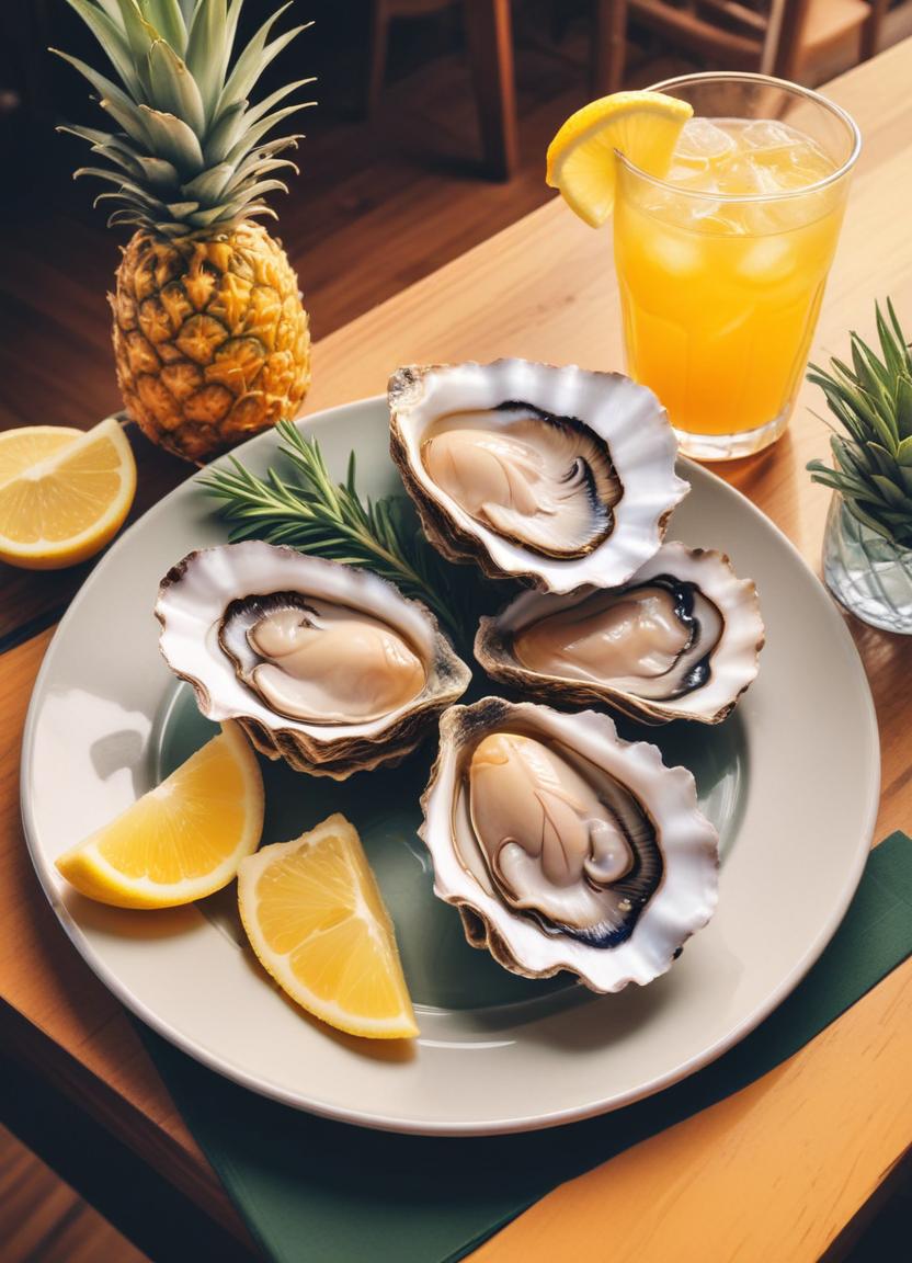 beverage, citrus, dinner, drink, food, fresh, garnish, glass, ice, juice, lemon, meal, orange, oysters, plate, rosemary, seafood, table, wedges, wooden