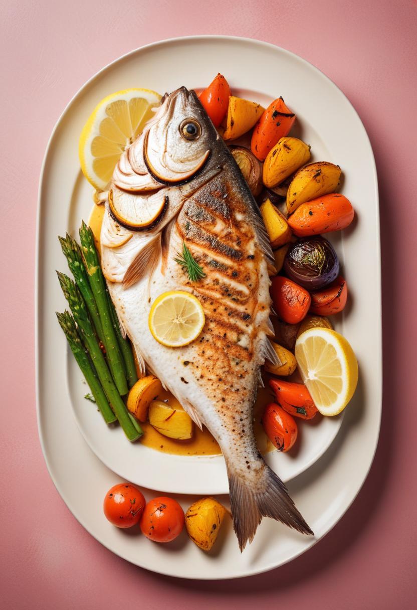 A grilled fish with lemon slices, asparagus spears, and roasted vegetables served on a white oval plate.