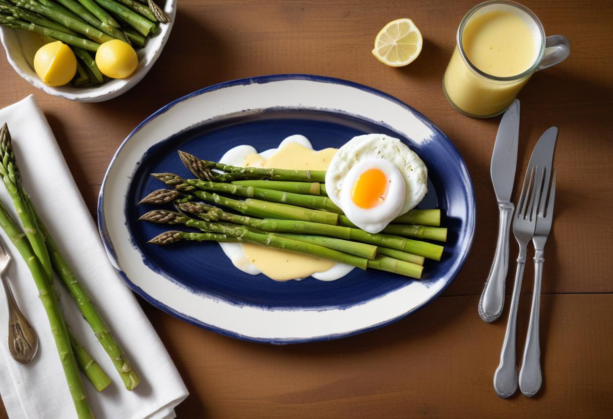 A plate of asparagus, hollandaise sauce, and a poached egg