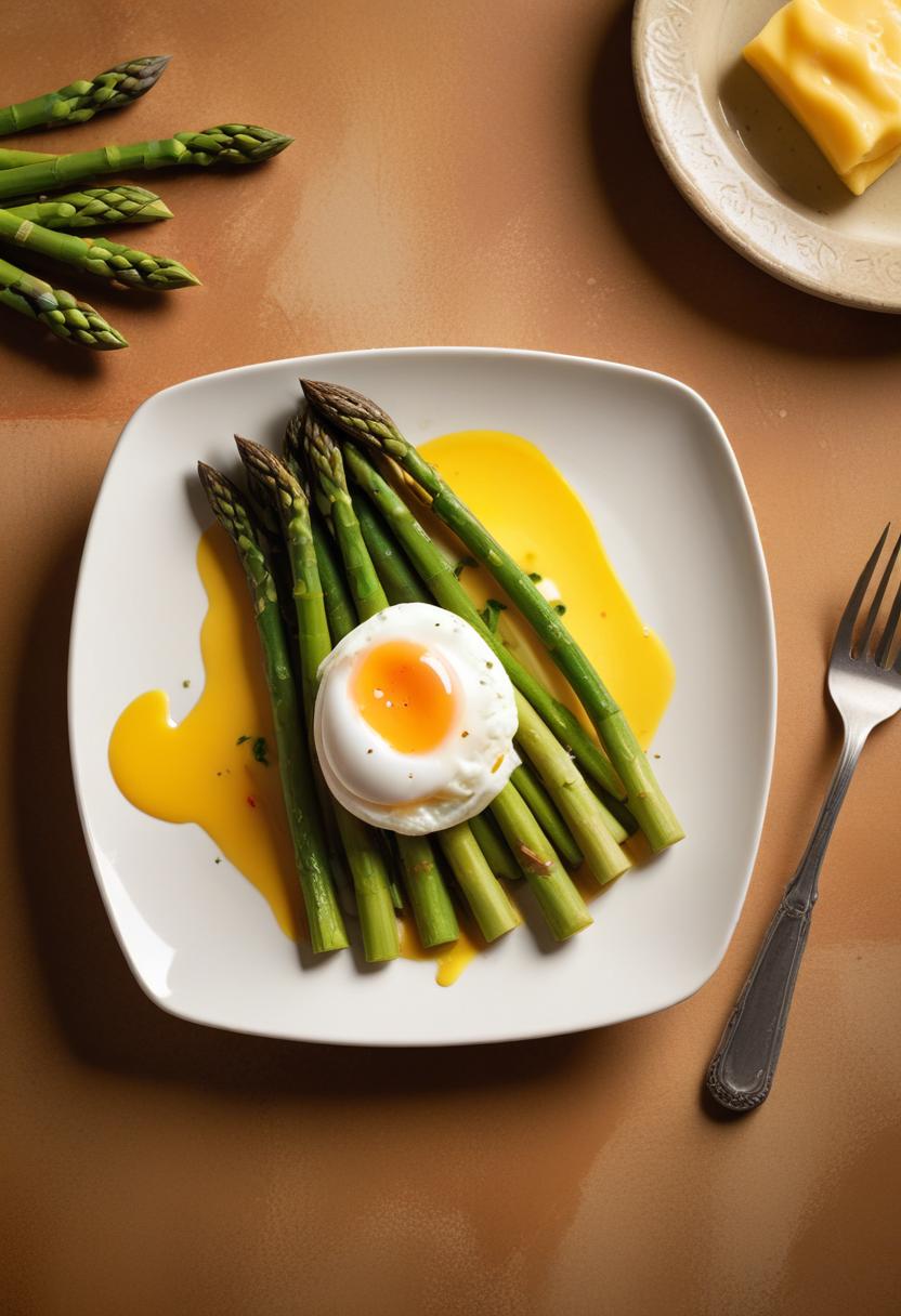 asparagus, breakfast, brown, cuisine, dinner, egg, food, fork, green, hollandaise, lunch, meal, plate, poached, sauce, surface, vegetable, white, yellow, yolk