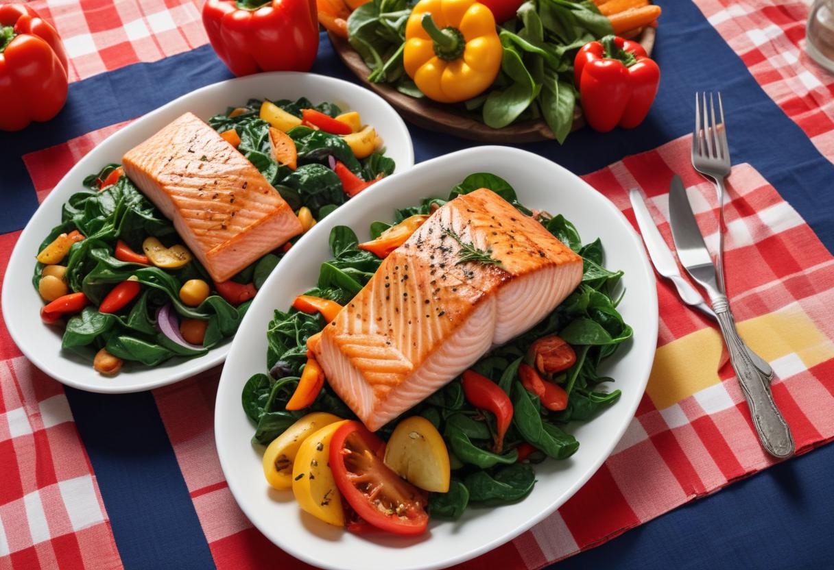checkered, cooked, delicious, dinner, food, healthy, meal, nutrition, onion, pepper, plate, protein, red, salmon, spinach, tablecloth, tomato, vegetables, white, yellow