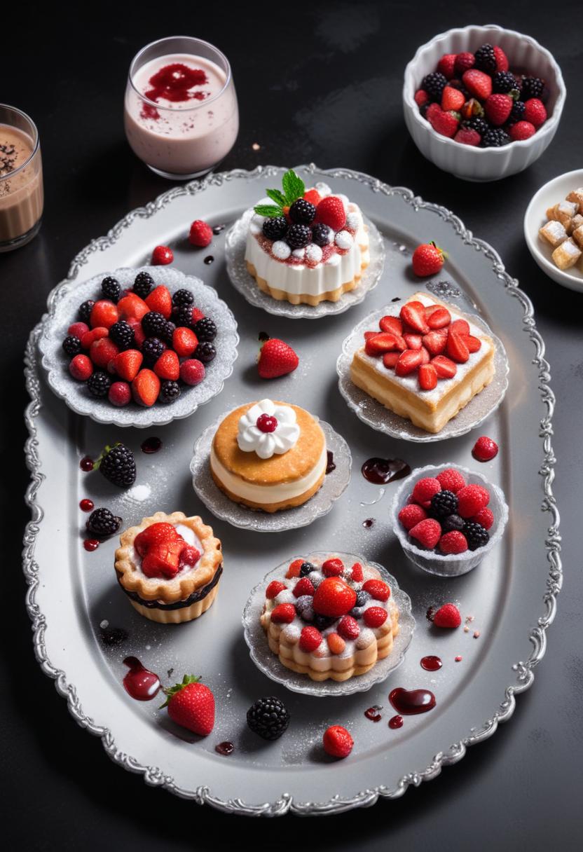 A silver tray with a variety of small cakes and tarts decorated with fresh berries