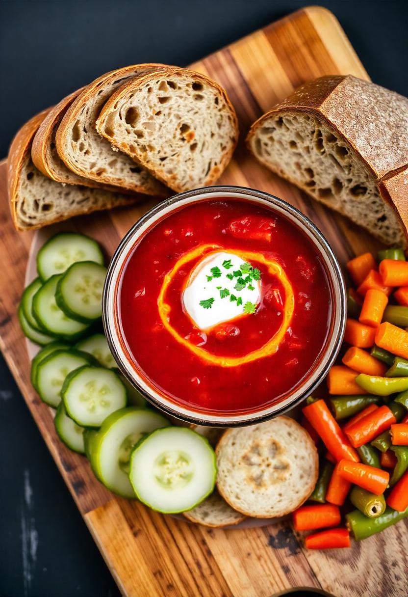 Red soup with cream, herbs, bread, cucumbers, and carrots