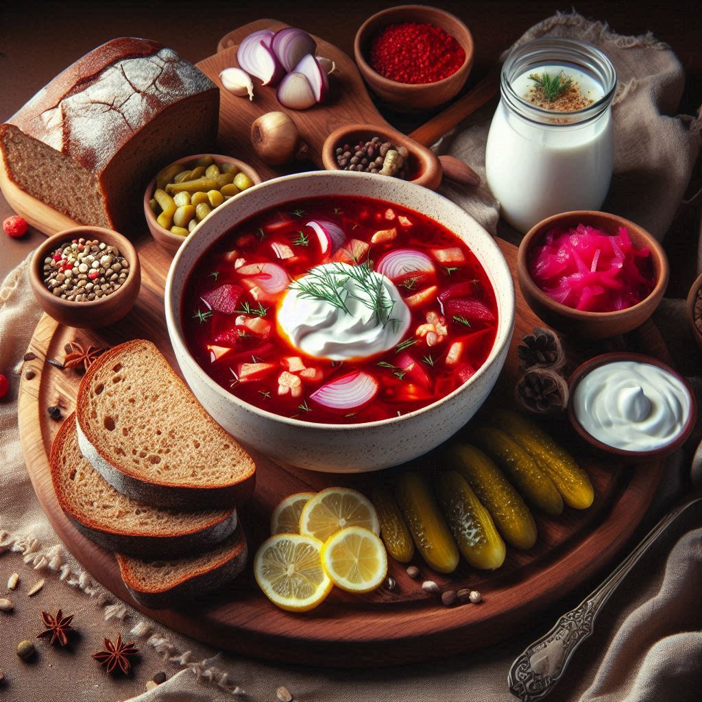 beet, borscht, bread, cream, cuisine, culinary, culture, dill, dinner, food, lunch, meal, onions, pickles, russian, soup, sour, spices, traditional, ukrainian