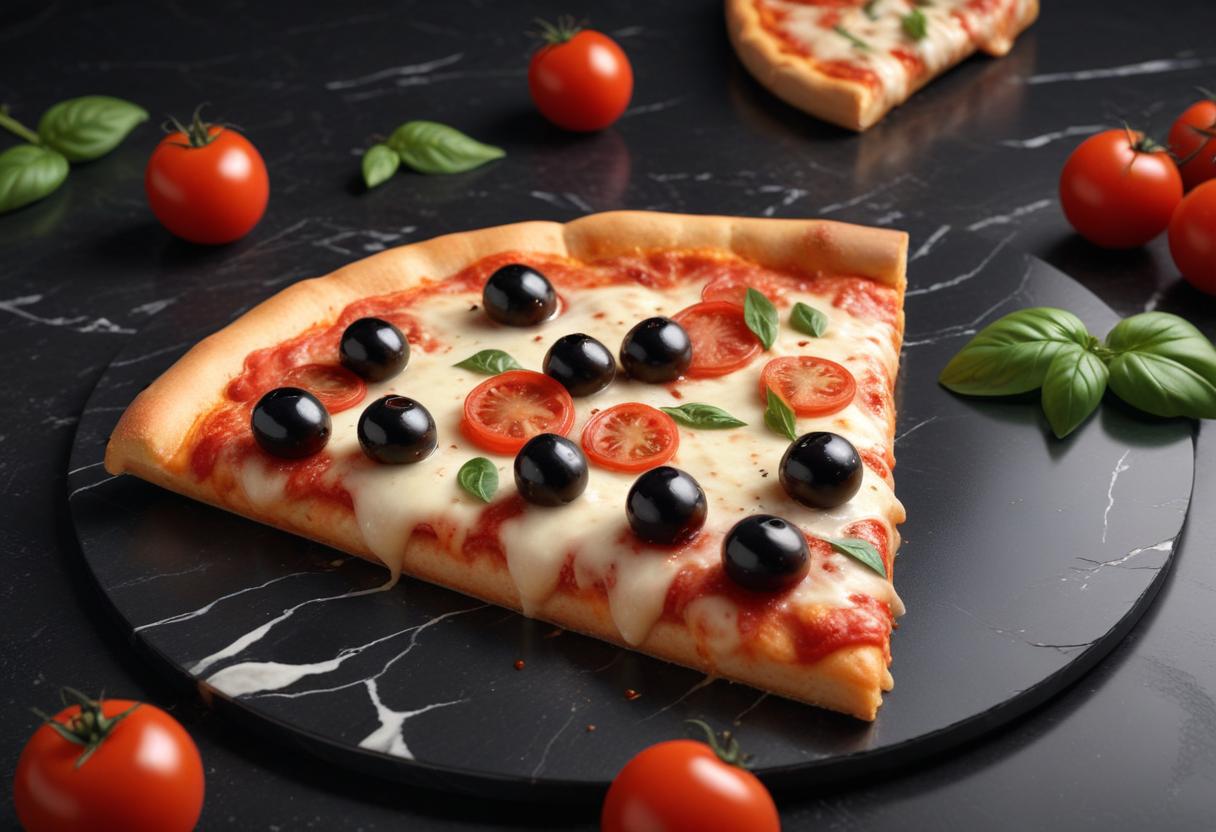 A slice of pizza with mozzarella, tomato, and black olives sits on a black marble surface