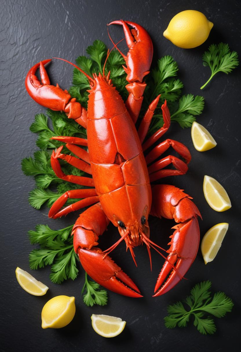 Lobster with lemon and parsley on black surface