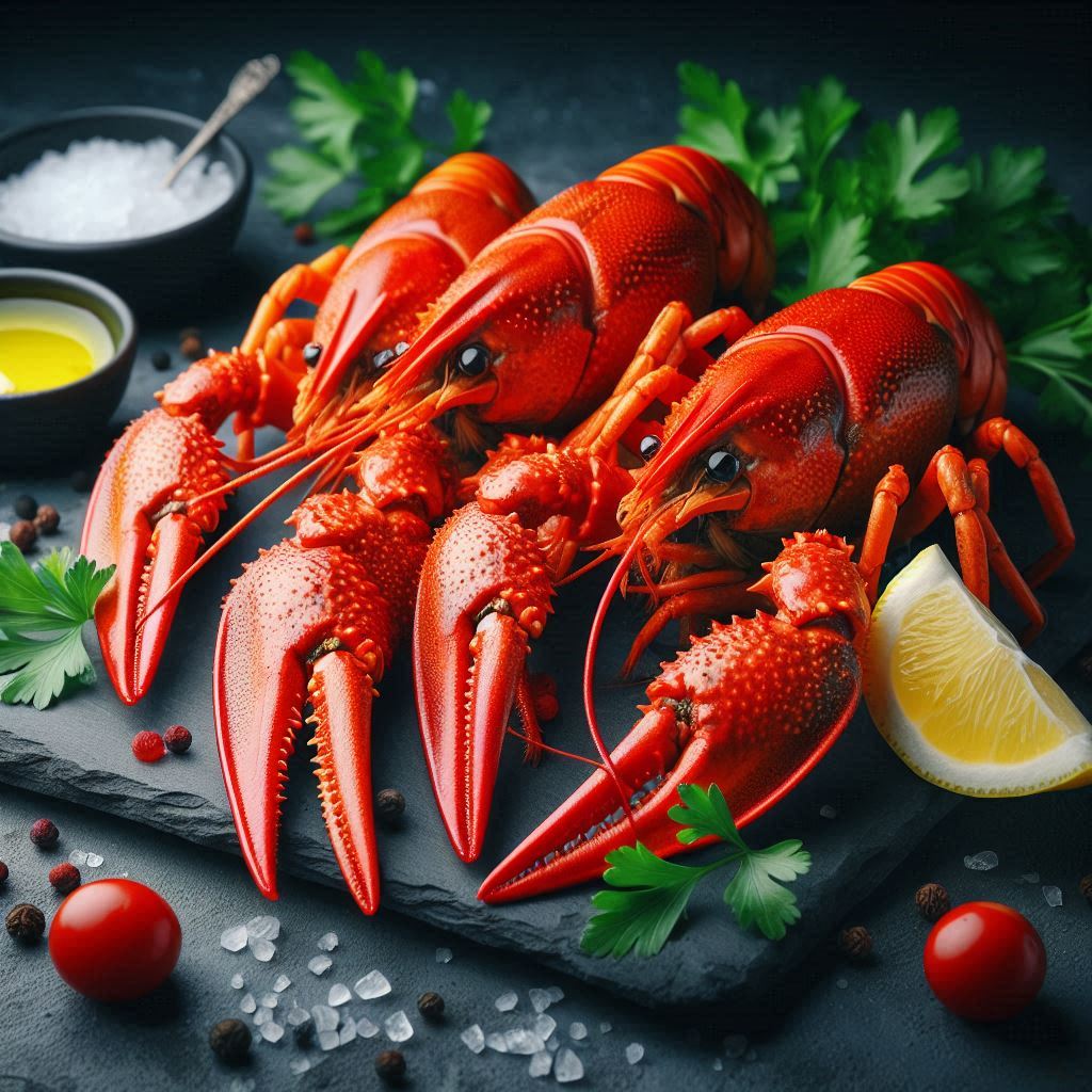 black, cooked, crawfish, crayfish, dinner, food, fresh, lemon, lobster, meal, parsley, pepper, plate, platter, red, salt, seafood, seasoning, shellfish, slate