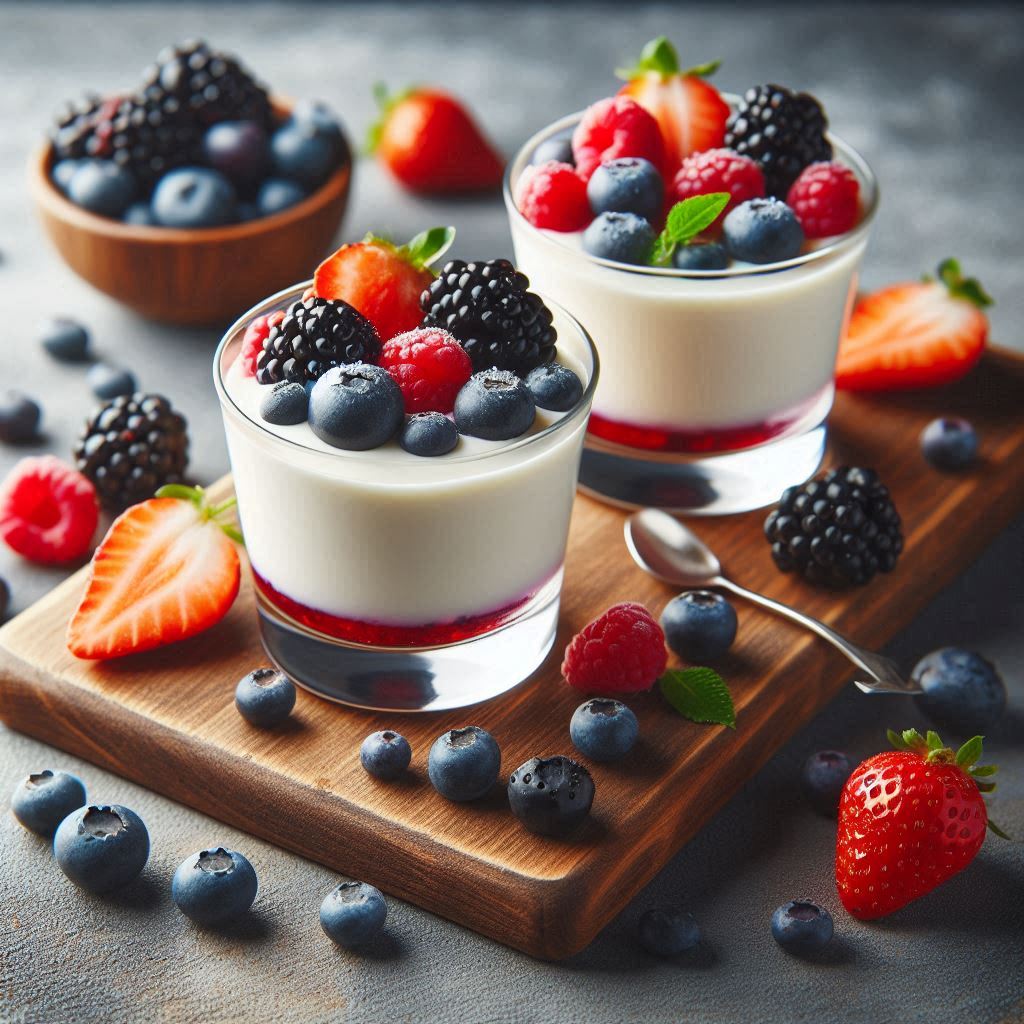 Two glasses of creamy yogurt topped with a mix of blueberries, blackberries, raspberries, and strawberries
