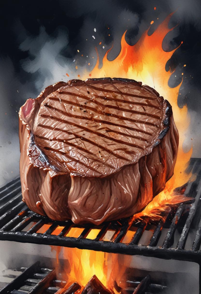 A juicy steak cooks over an open flame