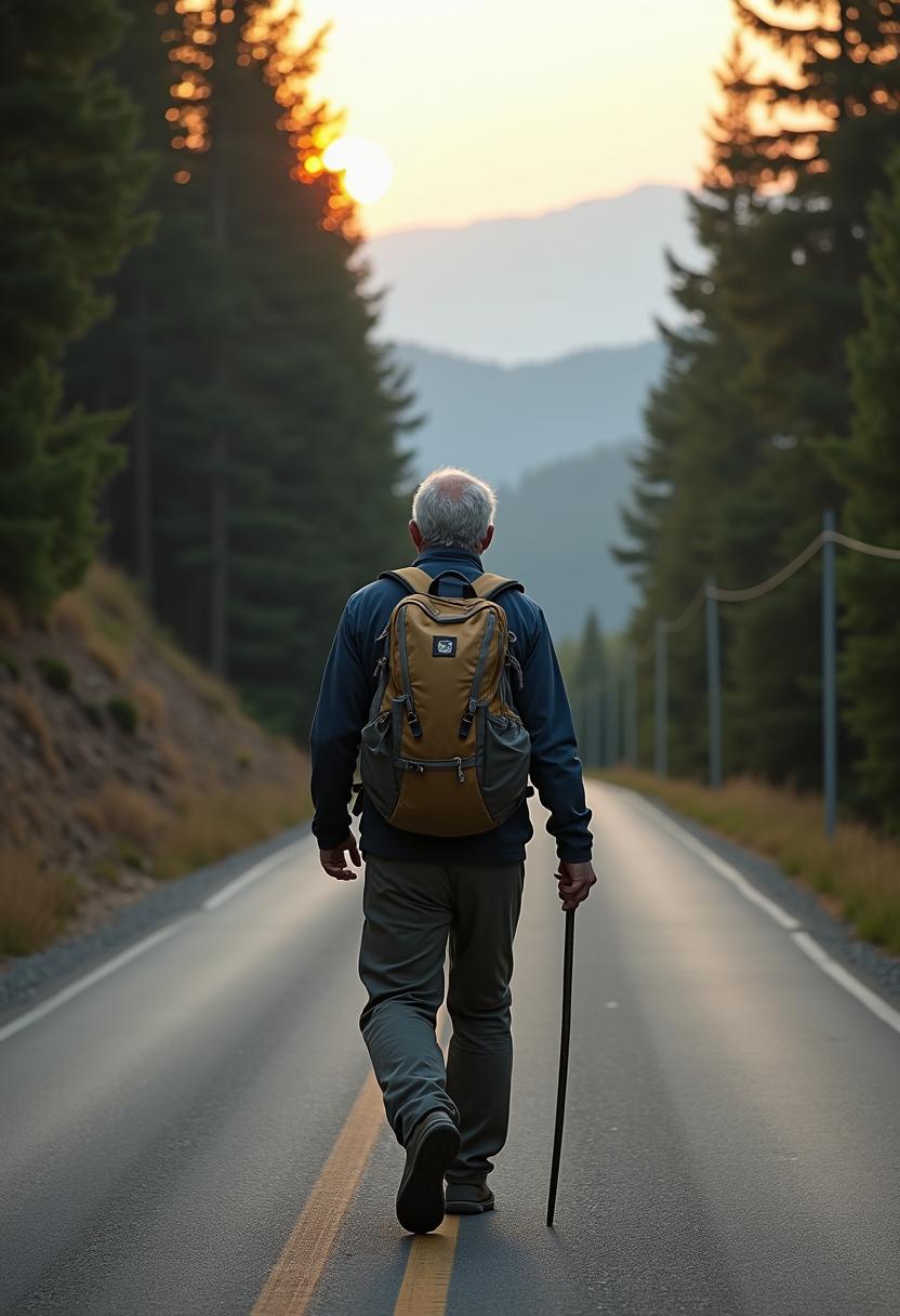 adventure, backpack, destination, forest, hike, journey, landscape, man, mountain, nature, outdoors, path, road, scenery, sky, stick, sunset, travel, trees, walking