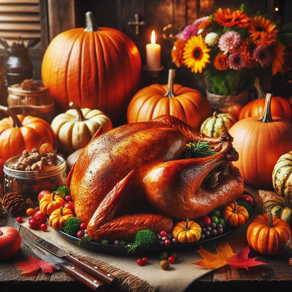 A roasted turkey sits on a platter surrounded by pumpkins, gourds, berries, and fall leaves
