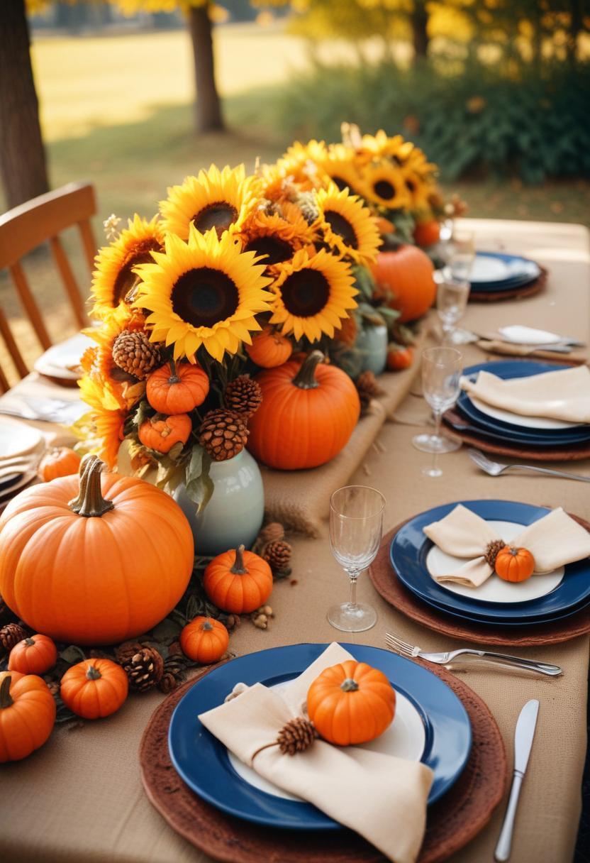 autumn, blue, centerpiece, decor, decoration, dinner, elegant, fall, festive, harvest, napkins, outdoor, party, plates, pumpkins, rustic, setting, sunflowers, table, thanksgiving