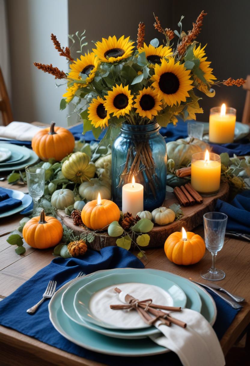autumn, blue, candlelight, candles, centerpiece, colors, cozy, decor, dinner, fall, home, plate, pumpkin, rustic, setting, silverware, sunflower, table, tablecloth, wooden