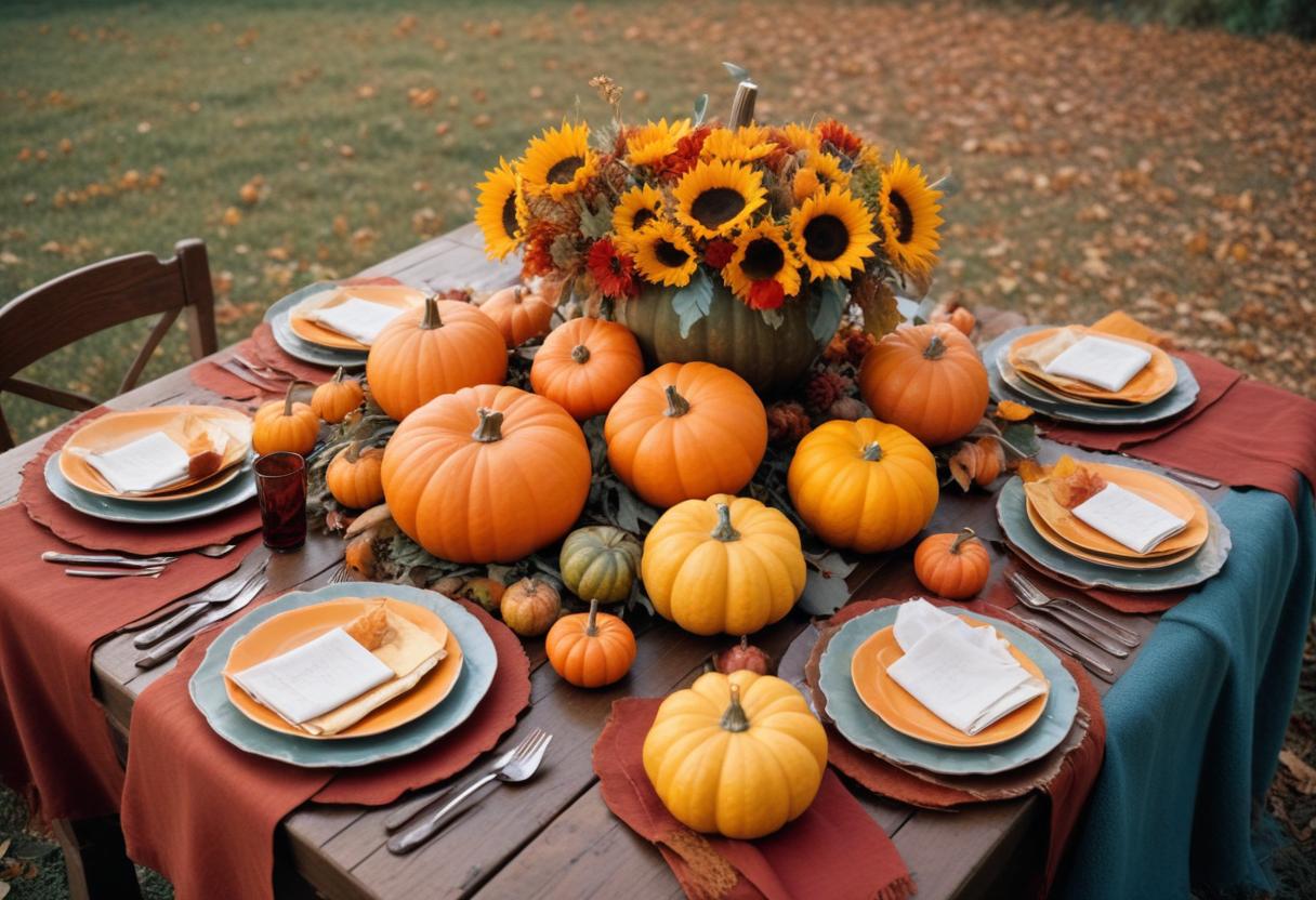 autumn, centerpiece, decoration, decorations, dinner, fall, harvest, holiday, home decor, napkins, orange, placemat, plates, pumpkin, rustic, setting, sunflowers, table, thanksgiving, wooden