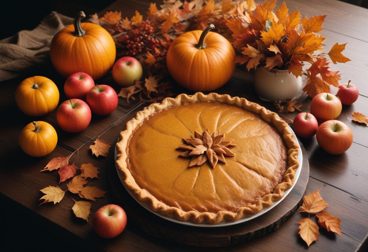 A large pumpkin pie sits on a wooden table surrounded by fall decorations, including pumpkins, apples, and fall leaves.