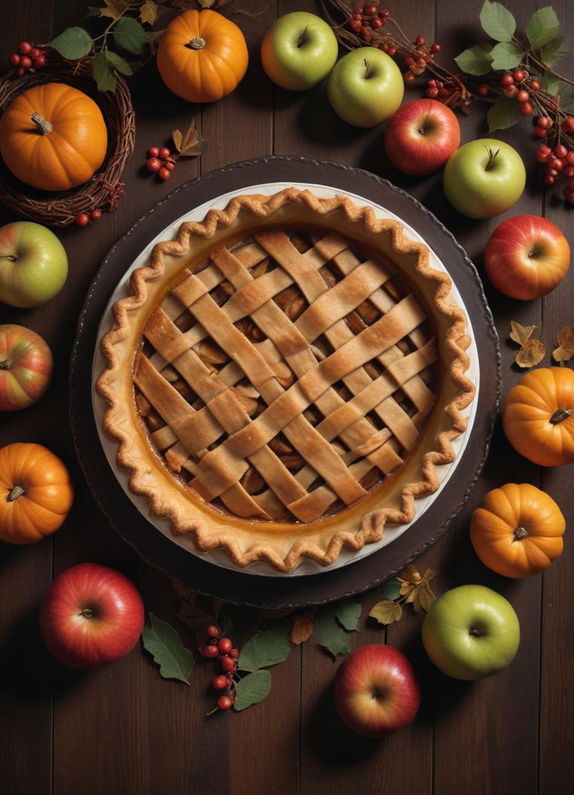 A delicious apple pie surrounded by autumn fruit
