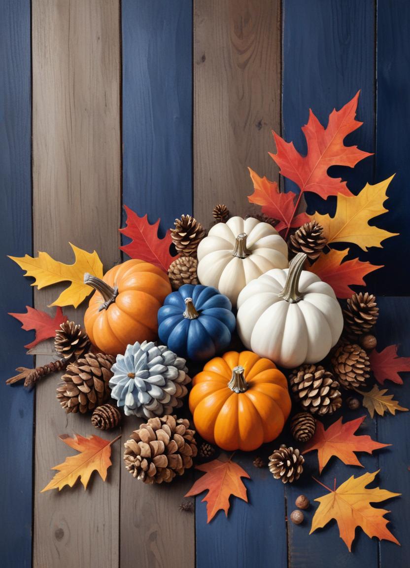 autumn, background, blue, brown, cozy, decor, decoration, fall, festive, harvest, leaves, nature, orange, pine cones, pumpkins, rustic, seasonal, thanksgiving, white, wood