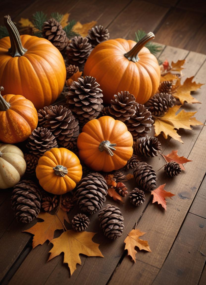 Pumpkins, pine cones, and autumn leaves are arranged on a rustic wooden surface.