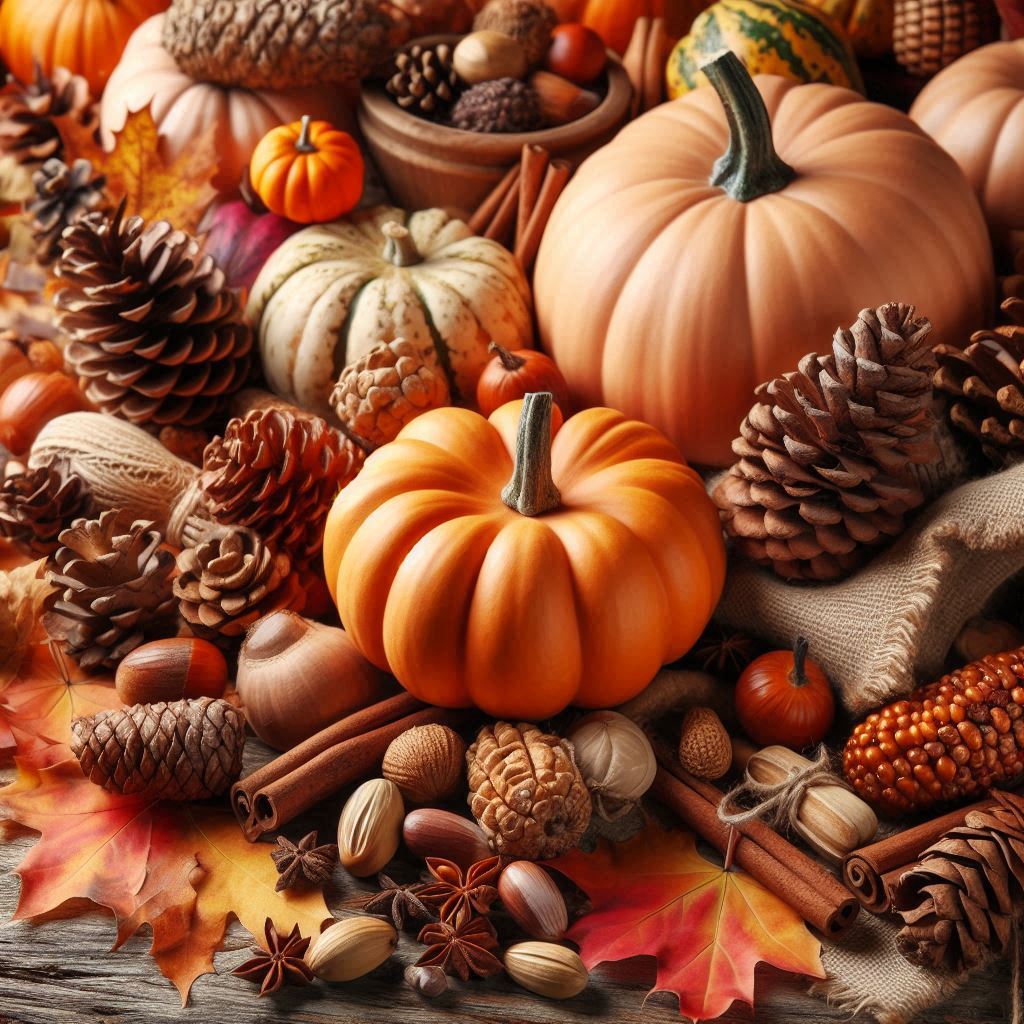 A variety of autumnal items, including pumpkins, pinecones, nuts, cinnamon sticks, and fall leaves, are arranged on a wooden table.