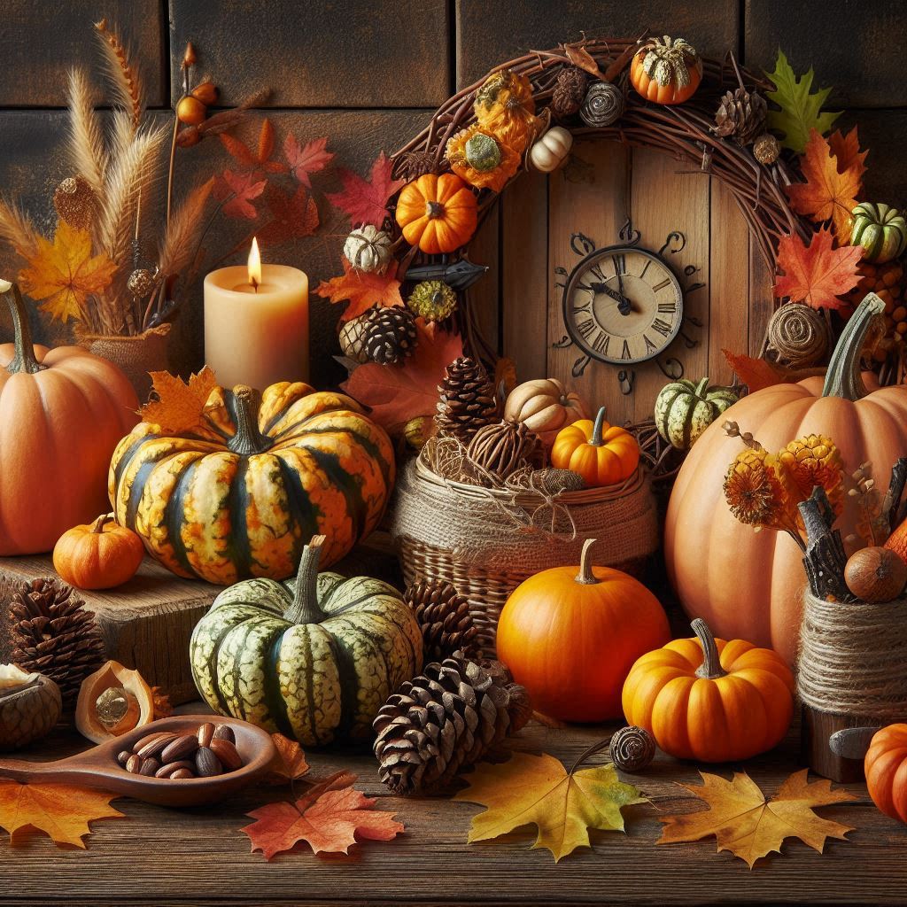 autumn, candle, clock, decoration, fall, fall colors, gourds, halloween, harvest, leaves, nature, pinecones, pumpkins, rustic, seasonal, still life, table, thanksgiving, vintage, wood