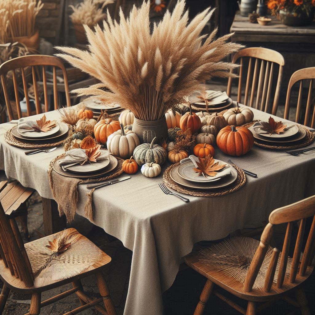 autumn, autumnal, centerpiece, chairs, decor, dining, fall, fall decor, harvest, home decor, leaves, linen, pampas grass, pumpkins, rustic, setting, table, table decor, tablecloth, wooden