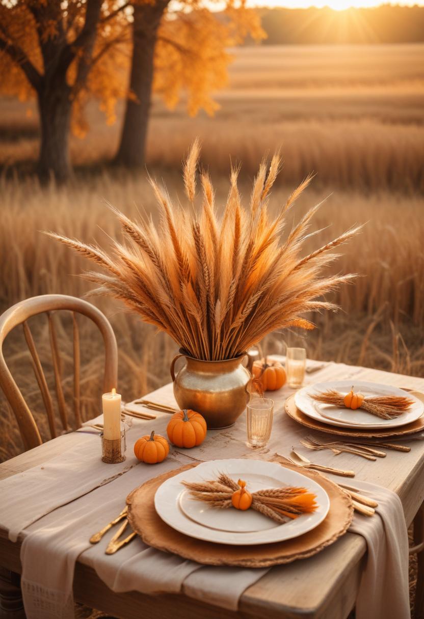 candle, centerpiece, chargers, copper, fall, field, golden, grass, holders, plates, pumpkins, rustic, setting, stalks, table, tablecloth, vase, wheat, white, wooden