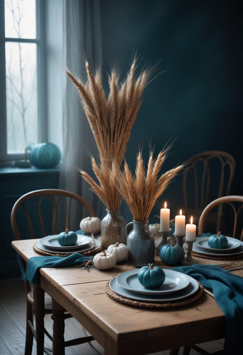autumn, blue, candle, cozy, dining room, fall, farmhouse, harvest, home decor, interior design, placemat, plate, pumpkin, rustic, table setting, thanksgiving, vase, warm, wheat, wooden table