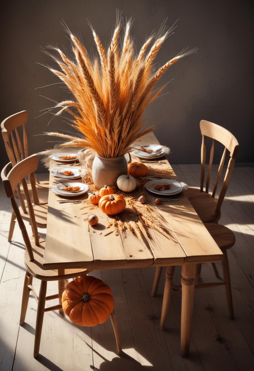autumn, centerpiece, chairs, cozy, decor, dining, dinner, fall, harvest, home, party, plates, pumpkins, rustic, silverware, stalks, table, vase, wheat, wooden