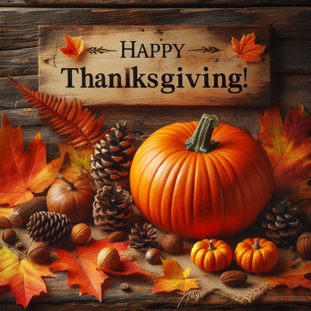 A large orange pumpkin sits on a wooden table with autumn leaves and pinecones around it. A sign above reads Happy Thanksgiving!.