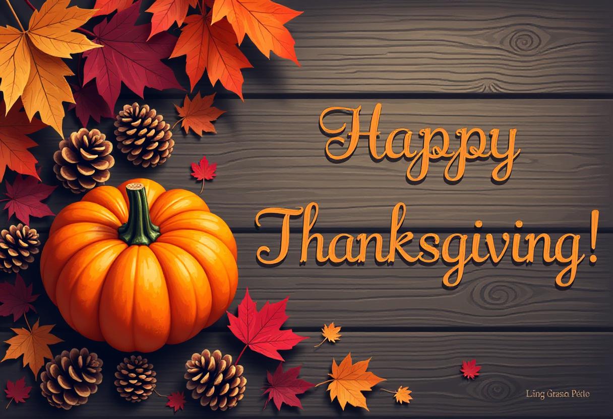 Happy thanksgiving with a pumpkin, leaves, and pine cones