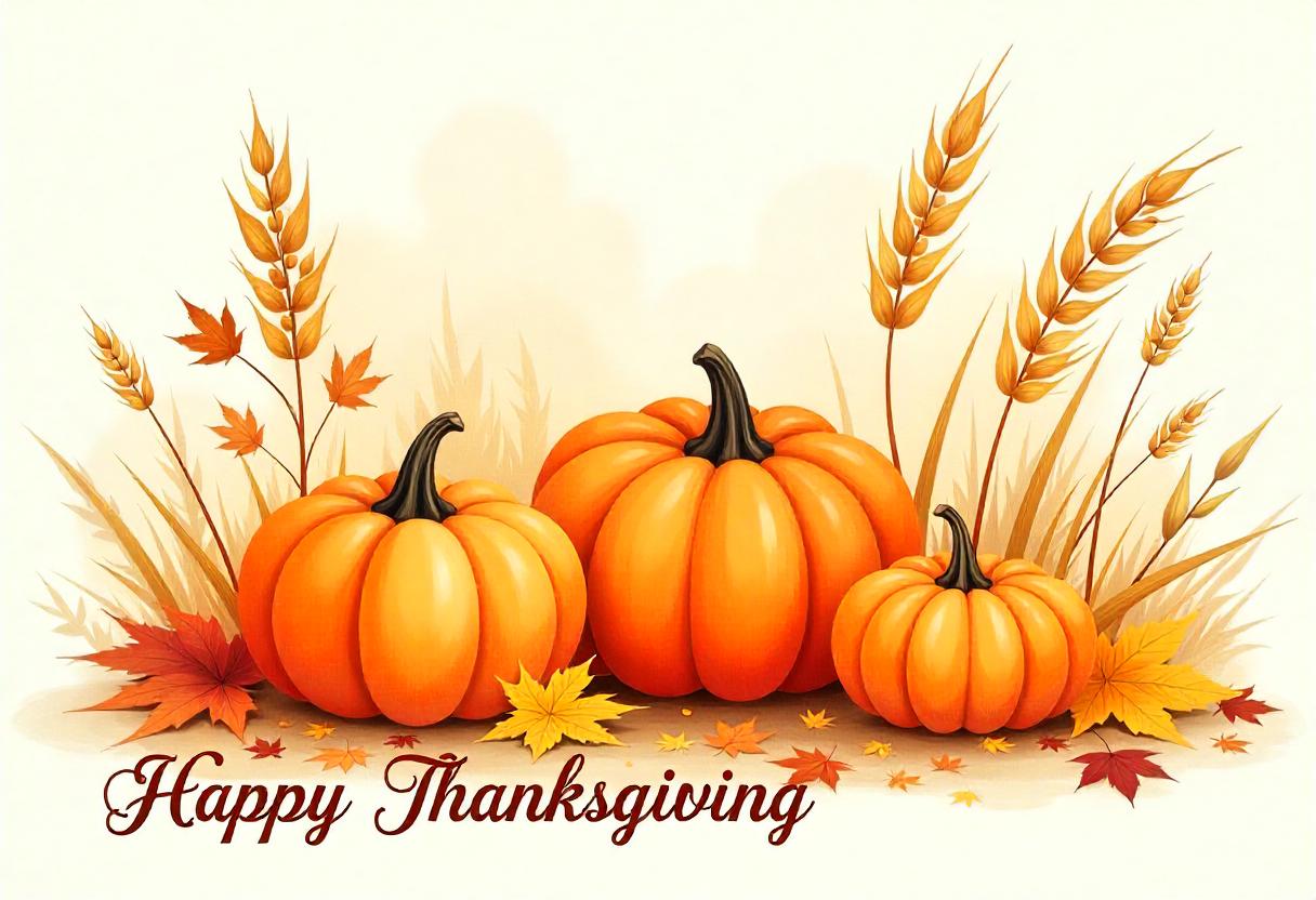 A colorful illustration of three pumpkins surrounded by wheat stalks and autumn leaves.