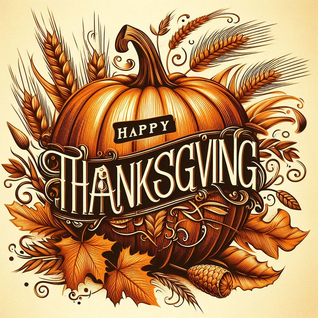 An illustration of a pumpkin with the words Happy Thanksgiving surrounded by wheat, leaves, and other autumnal details.