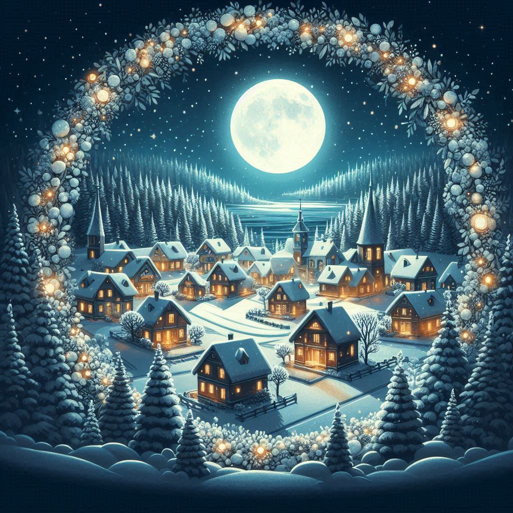 A snowy village sleeps under a full moon