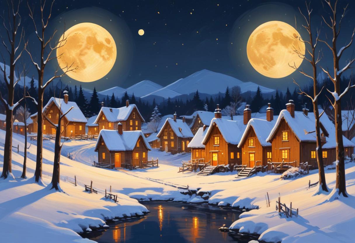 A snowy village with houses and a river illuminated by a full moon in the night sky.