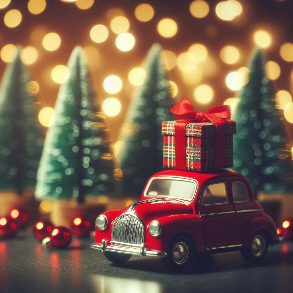 bokeh, car, celebration, christmas, december, festive, gift, green, happiness, holiday, joy, lights, miniature, plaid, present, red, ribbon, season, toy, tree