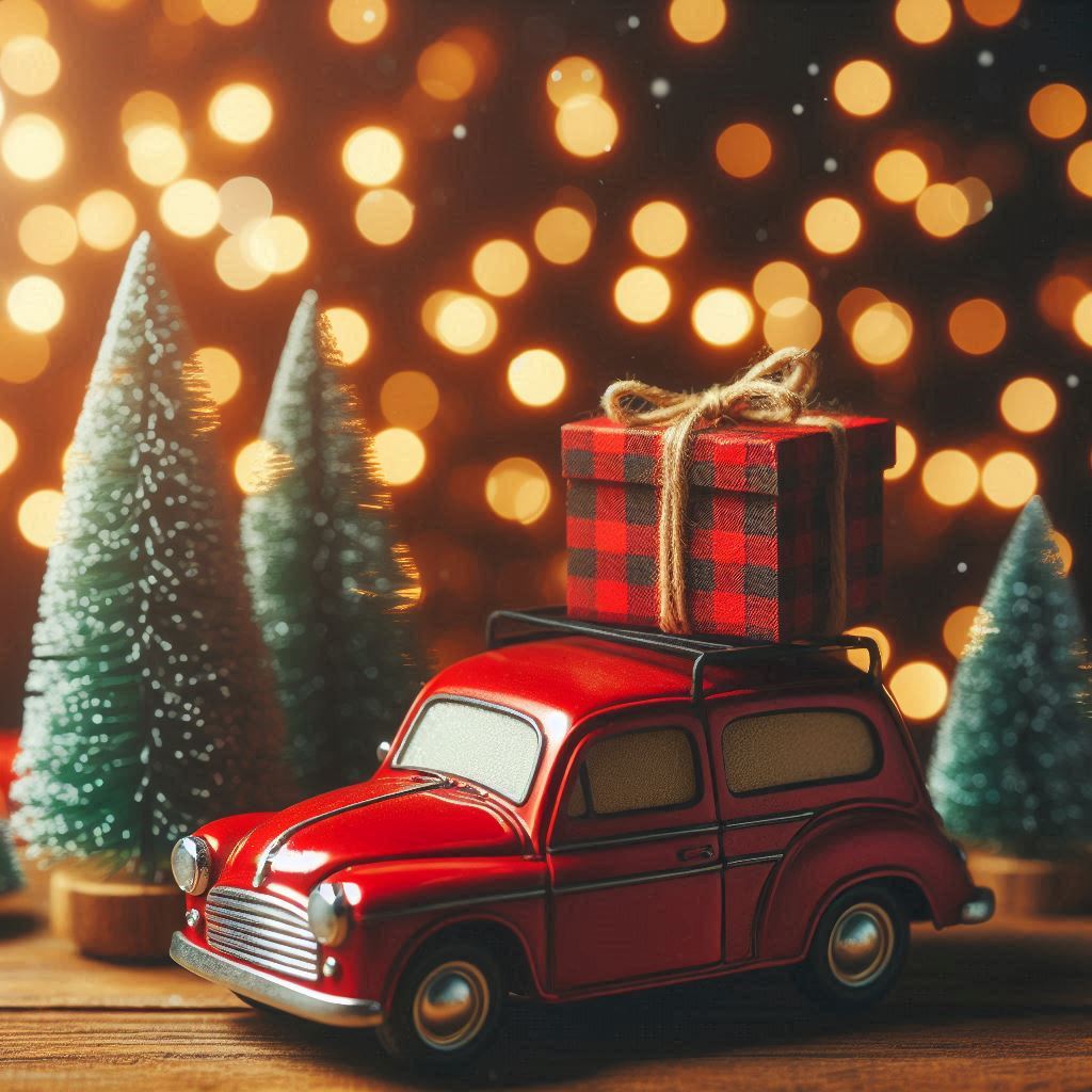 A red toy car with a gift tied with twine on the roof sits in front of two miniature Christmas trees. The background is a bokeh of warm golden lights.
