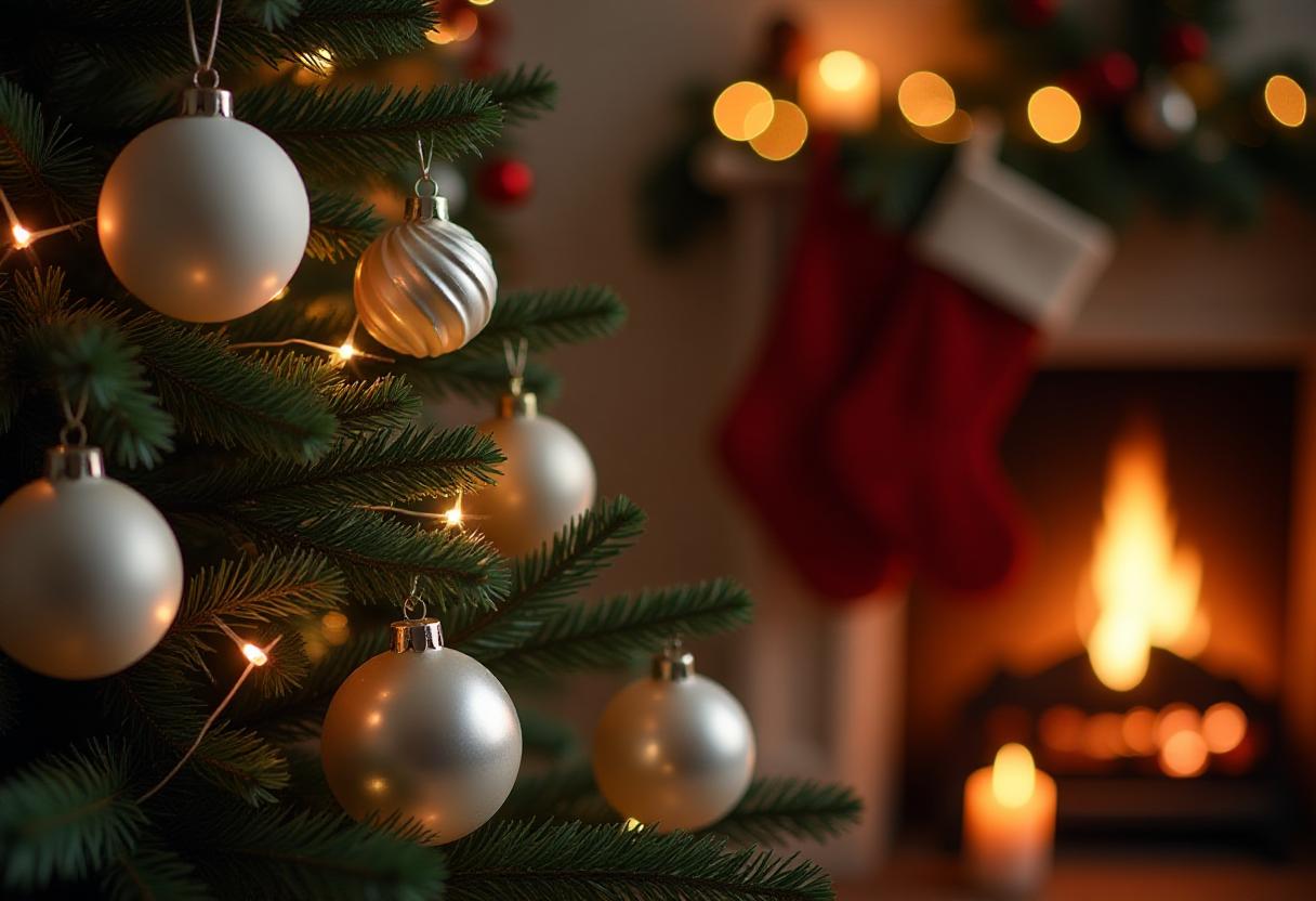 A decorated Christmas tree with white ornaments and twinkling lights is in front of a fireplace with a stocking hanging above it.