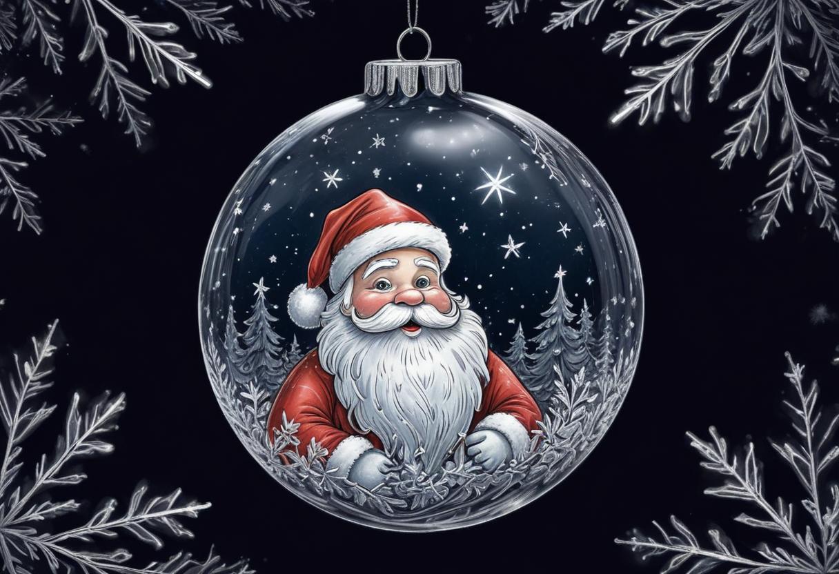 A hand-drawn illustration of Santa Claus smiling inside a glass Christmas ornament. The ornament is surrounded by silver-grey snowflakes.