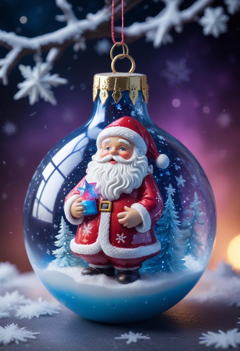 A blue glass Christmas ornament hangs from a snowy branch. Inside, a figurine of Santa Claus stands on a layer of fake snow, holding a gift.