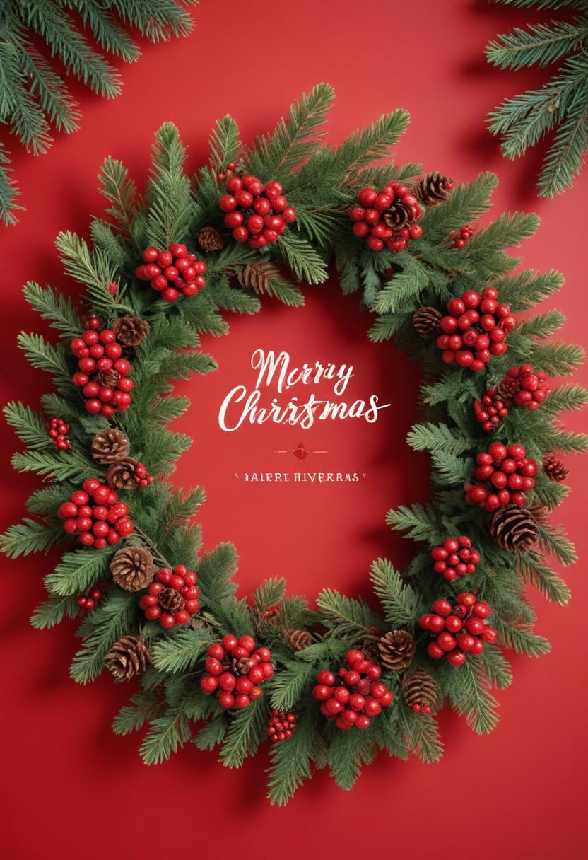 A green Christmas wreath with red berries and pine cones is placed on a red background.