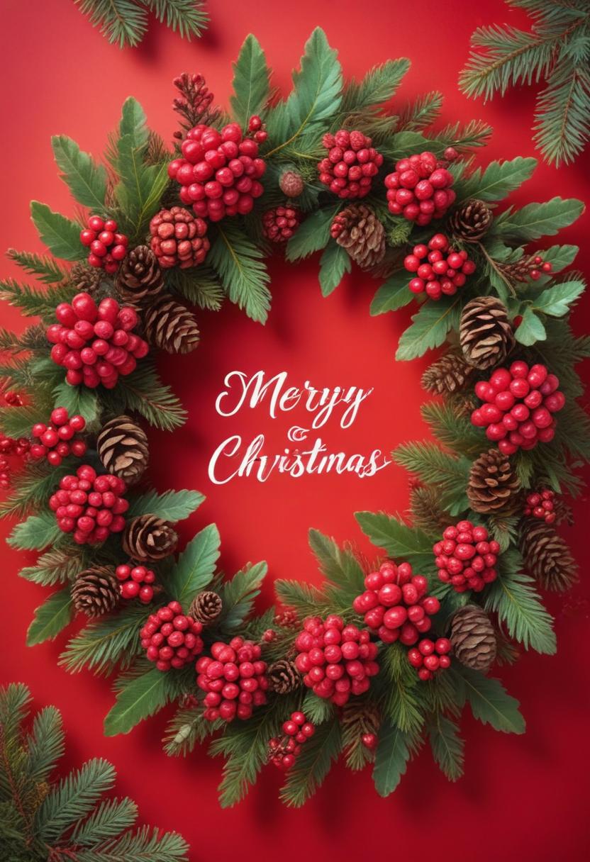 A Christmas wreath made of green pine branches, red berries, and pine cones. It is arranged in a circle and placed against a red background.