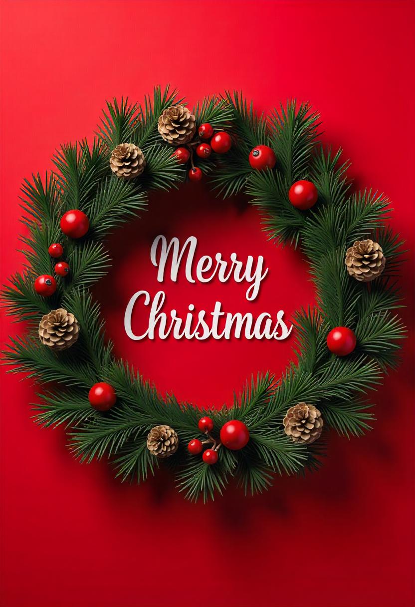 A green Christmas wreath with red berries and pine cones is displayed on a red background. The wreath surrounds the words Merry Christmas in white.