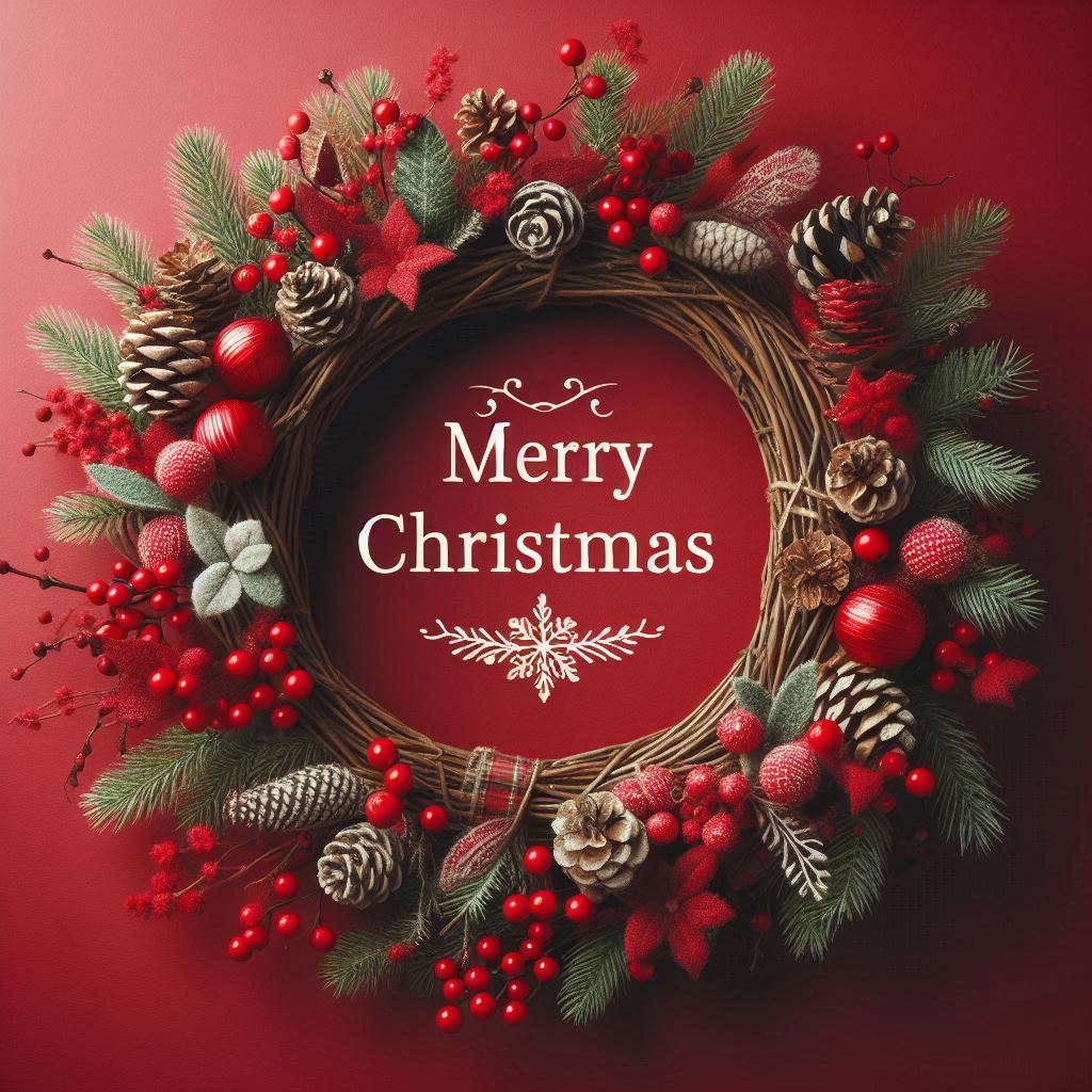 A close-up view of a Christmas wreath with a red background. The wreath is decorated with pine cones, red berries, and evergreen branches.