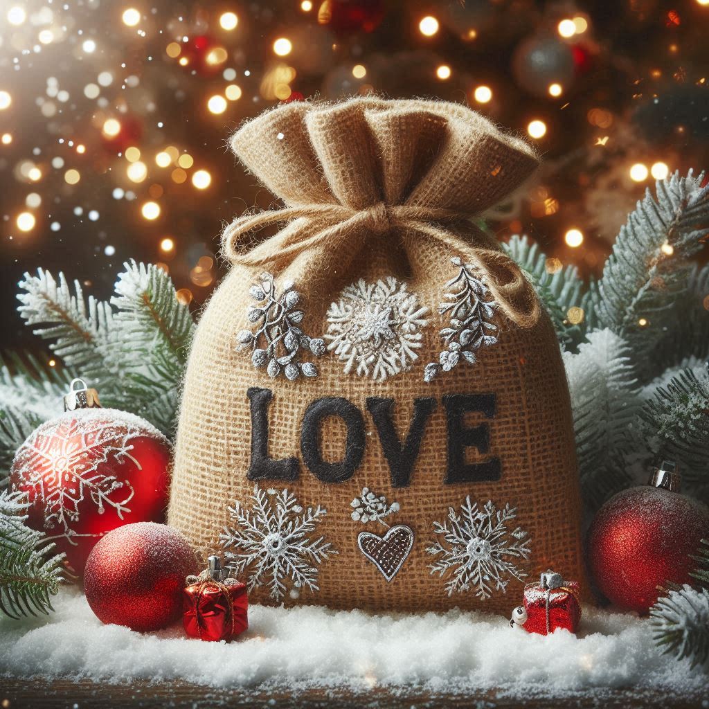 A rustic burlap sack with the word Love embroidered on it sits surrounded by snow and Christmas ornaments.