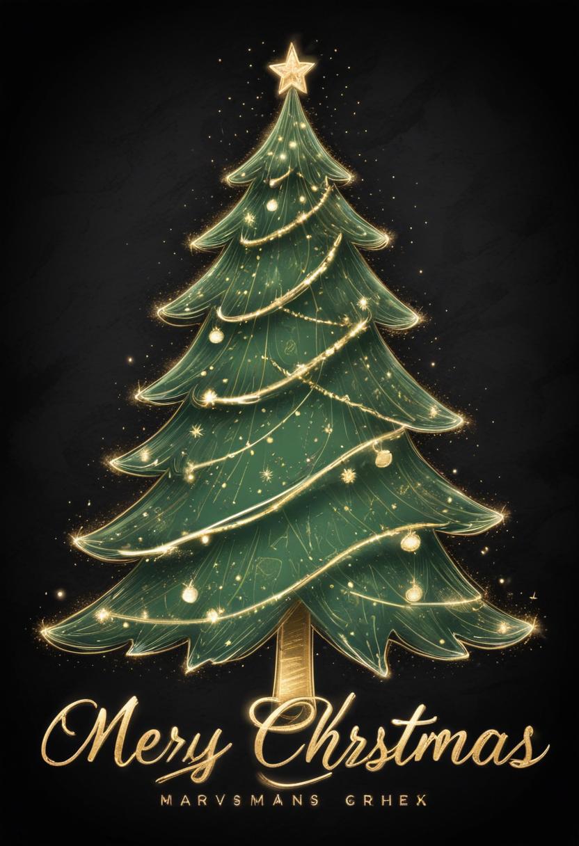 A digital illustration of a Christmas tree with a star on top and gold lights, ornaments, and sparkles, against a dark background.