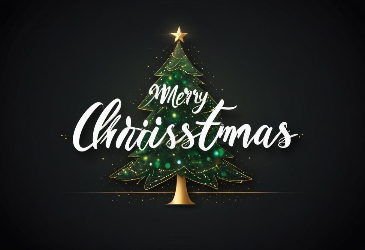 A stylized Christmas tree with a gold star and lights, set against a black background with Merry Christmas in white script.