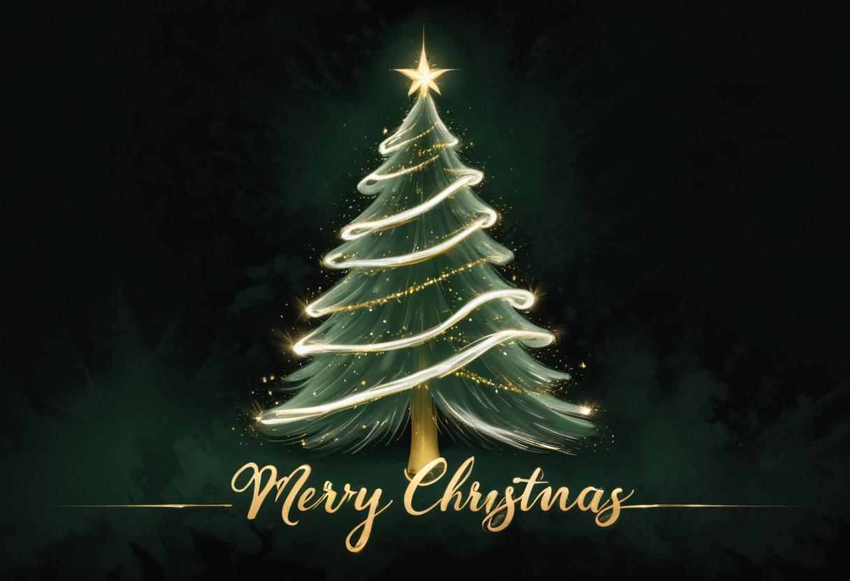 A stylized Christmas tree with golden lights and a star on top against a dark green background.