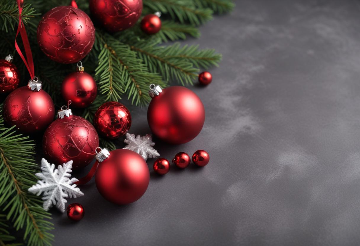 Red Christmas ornaments and green pine branches are arranged on a gray surface. There are also silver snowflakes and small red ornaments.
