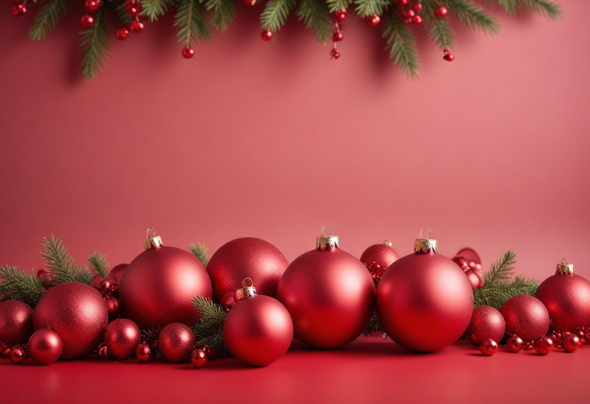 A group of red Christmas ornaments lay on a red background with pine sprigs.